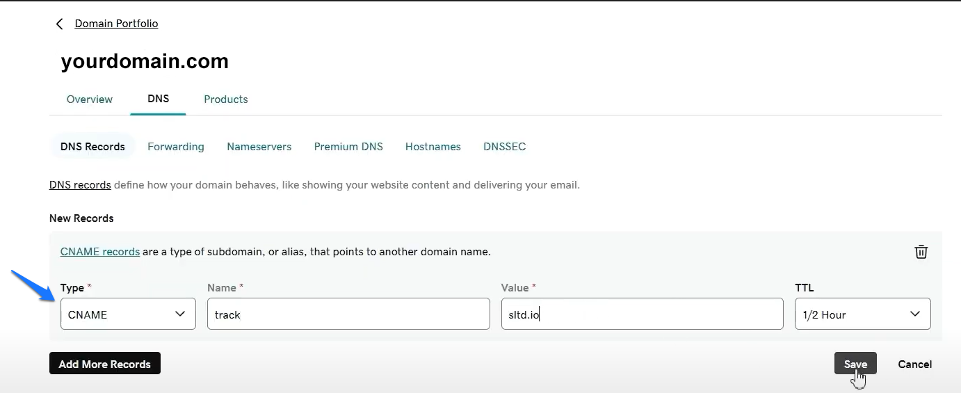 - This time, under record type in the dropdown menu, find CNAME, and paste the details provided in SMARX’s Custom tracking domain settings.