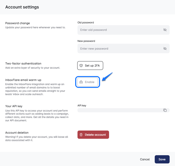 1. To start, you need to enable your InboxFlare account in SMARX. Go to your Account settings in SMARX and find the InboxFlare email warm-up. Click “Enable”.